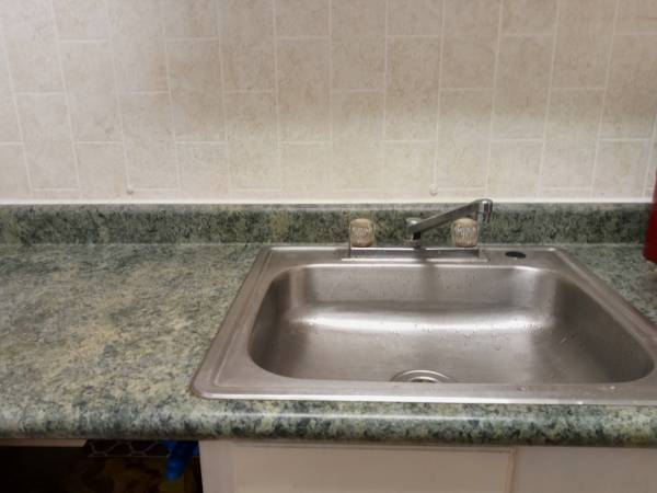 lightly used, few months old kitchen countertop, with stainless steel sink and faucet - package: 53L x 25D with backsplash) - $100obo Other countertops and cut outs for shelving available.