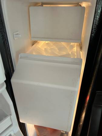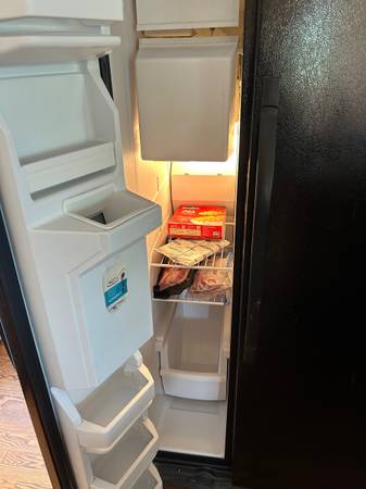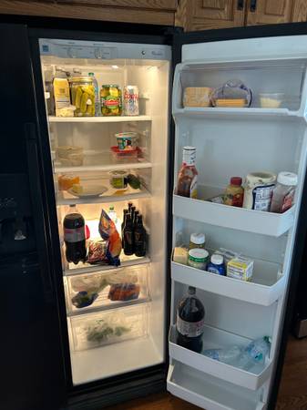 Full size Black side by side refrigerator/freezer. Works great. Has a minor stain by the water dispenser.