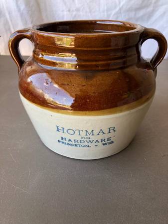 One (1) advertising bean pot from Princeton, Wisconsin. No chips or cracks that I can see. Handles are completely intact. The coloration on the very bottom is NOT a chip but extra glaze. It is in...