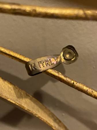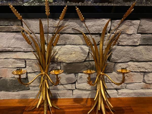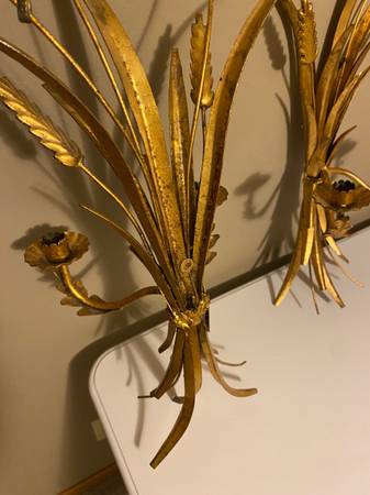 Pair of vintage gilt gold metal wheat wall sconces with two candle holders. Excellent condition. Made in Italy tags. 23” height, 12” width, 6” depth from candle holders