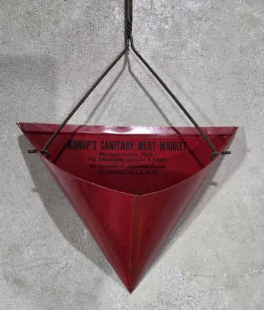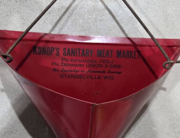 This antique advertising dust pan is in excellent condition. Konop's Sanitary Meat Market Stangelville, Wisconsin.