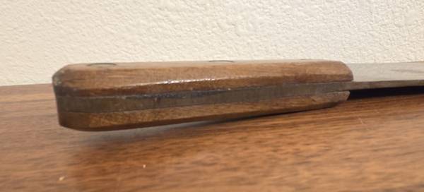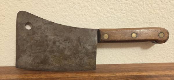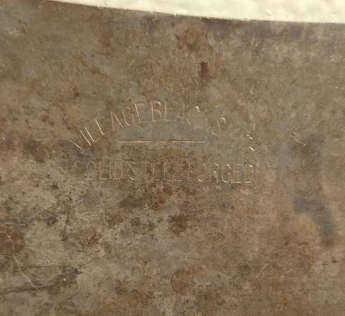This is an antique Wisconsin made Village Blacksmith meat cleaver knife. It measures roughly 11" overall length with a 6" x 4 1/4" tall blade. It is in excellent used condition.