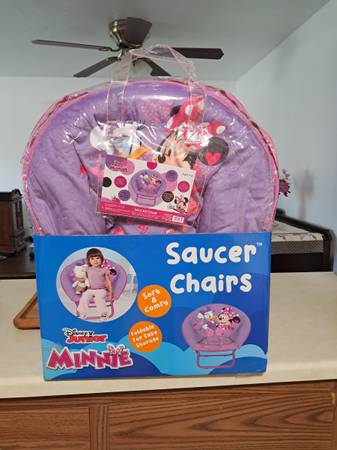 NEW NEVER OUT OF PACKAGE. STURDY STEAL FRAME. AGES 3-8 COZY PLUSH CUSHION. FOLDS FOR EASY STORAGE.
