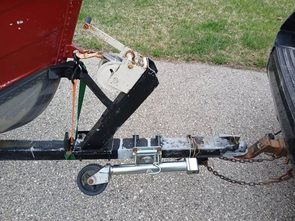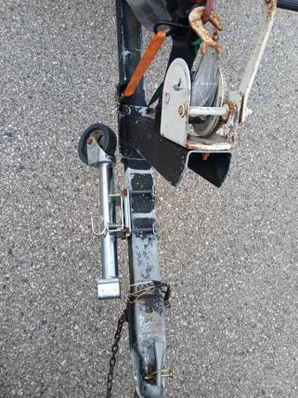 Trailer is a Sears Gamefisher double bunk trailer, welded, galvanized, newer tires, bearing buddies, custom guide-on posts with lights. Includes safety chains and working winch on the bow post.