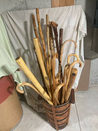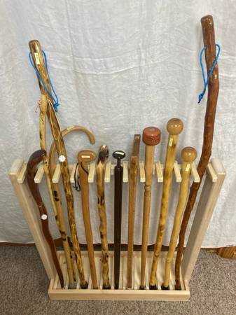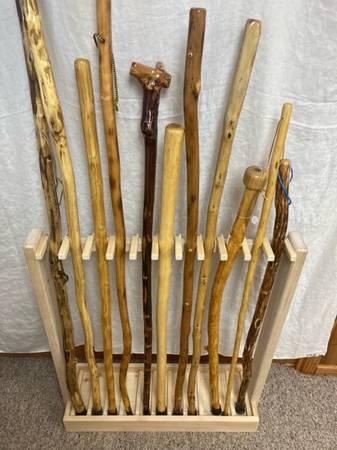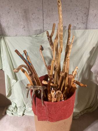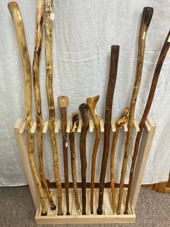 Nice variety of handcrafted walking sticks. Smooth as a baby’s butt! Coated with 3 coats of polyurethane varnish. Over 49 to choose from— all different shapes and sizes. Don’t go to a retail store and buy some foreign junk. Buy local and save yourself some money. Prices are $10.00-$11.00 for the canes . Hiking sticks from $16.00-$25.00. Not only can hiking sticks be used for keeping your balance —- but they can also be used for to ward off an attack from a wild animal. You won’t be disappointed! CASH ONLY! No SCAMMERS!!!