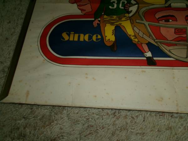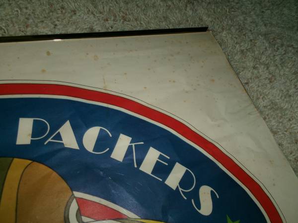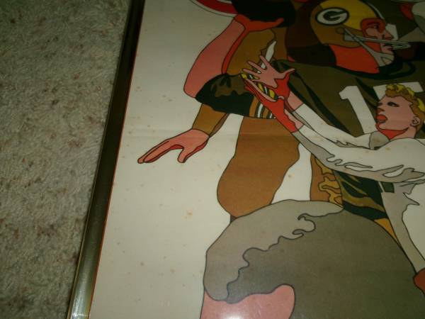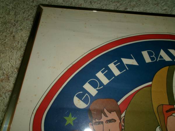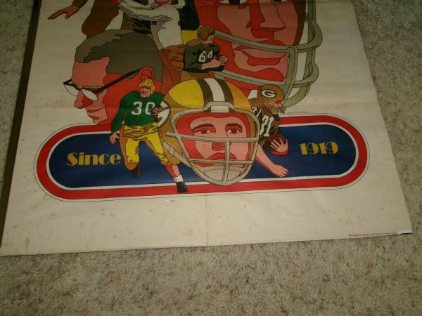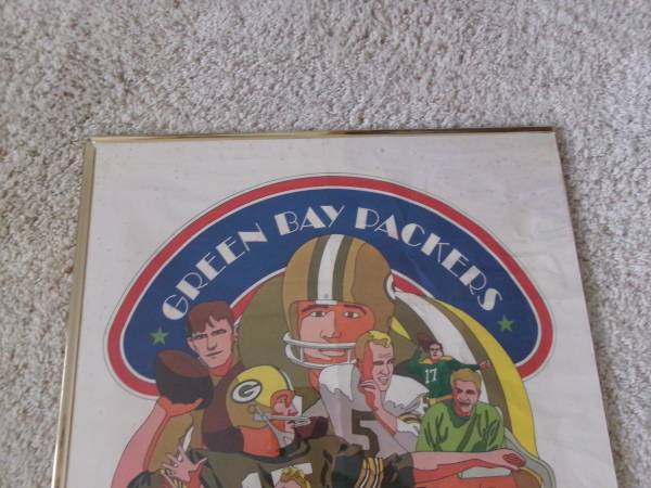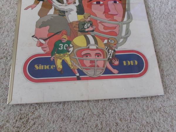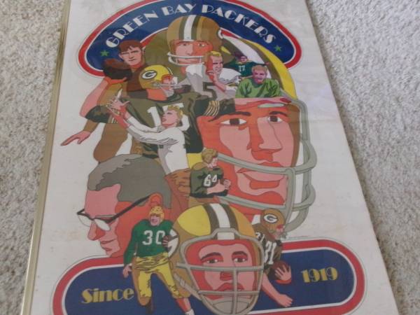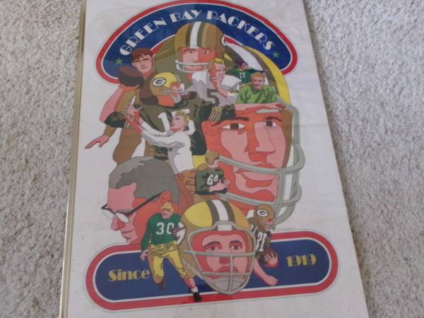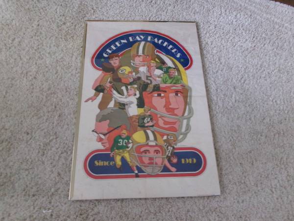 Here's a vintage 24x36" poster Green Bay Packers Since 1919 by artist David Johnston - Marked on the bottom right corner: NFL Collector's Series - 1968 National Football League. This poster is very old and does shoes age spots thru out the poster. It is enclosed in a plastic frame but two of the borders of the gold plastic frame is missing. Selling as is. Asking 25.00 cash only. Please text if interested. Will meet you at the front of McDonalds in Denmark for safety reasons for both you and I. Thank you.