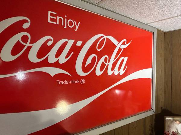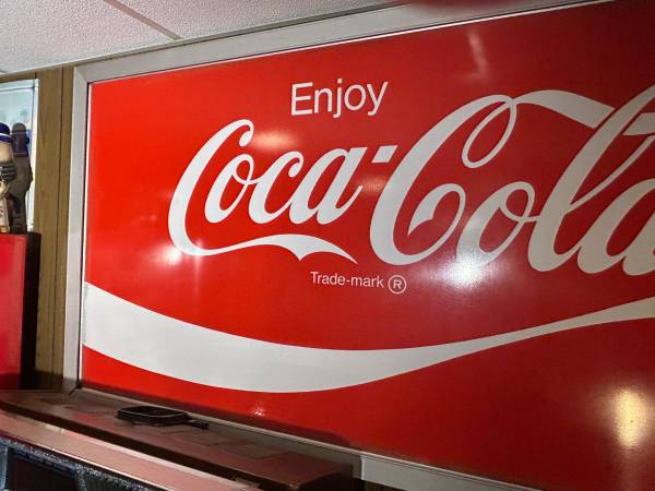 Rare Find. Framed vintage Coca-cola sign circa 1969 -1985 features Coca-Cola ribbon logo with ever classic red and white design. Sign was originally on a delivery truck. Excellent condition, minor scratches on the bottom from the frame, has been hanging inside for over 30 years. Metal with aluminum framing. Size: Height 34”, Width 68”, Depth 1.5 “. Pick up only, Green Bay WI 54302.