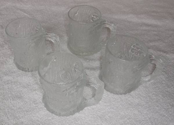 For sale are two different sets (of 4) - 'Flinstones' glass themed mugs. These were promotional items back in 1993 by McDonalds restaurants. I have the "Pre Dawn" mug set with exterior texture and a...