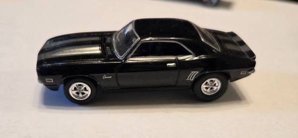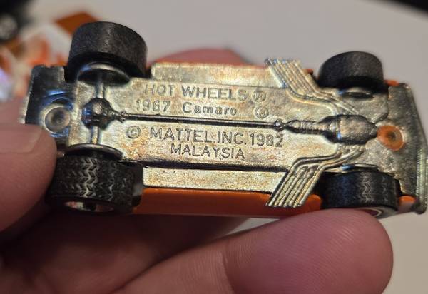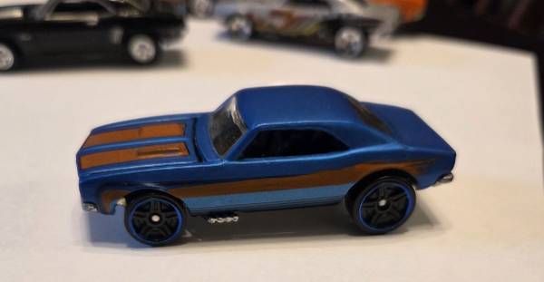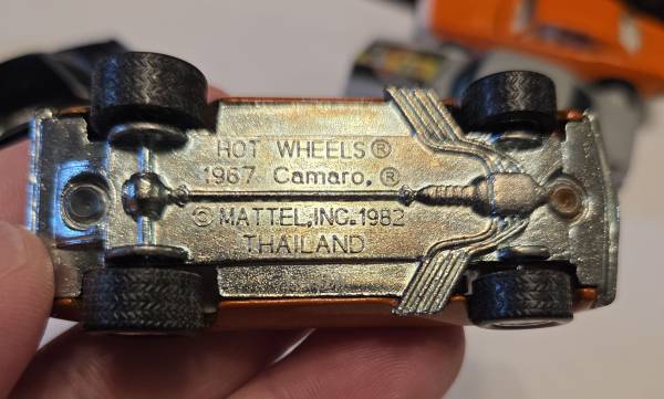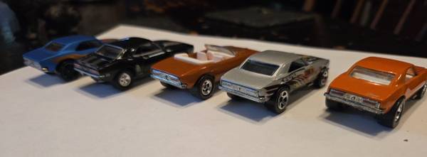 Black is a 1990 Playing Mantis Johnny Lightning 69' Camaro, convertible is a 1982 Hotwheels 67' Camaro, silver is a 1982 Hotwheels 68' Camaro, and the orange is a 1982 Hotwheels 68' Camaro.