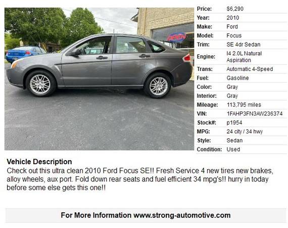 Check out this ultra clean 2010 Ford Focus SE!! Fresh Service 4 new tires new brakes, alloy wheels, aux port. Fold down rear seats and fuel efficient 34 mpg's!! hurry in today before some else gets...