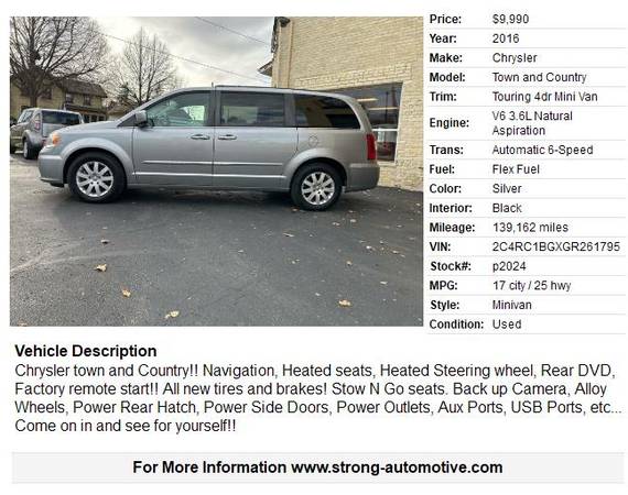 Chrysler town and Country!! Navigation, Heated seats, Heated Steering wheel, Rear DVD, Factory remote start!! All new tires and brakes! Stow N Go seats. Back up Camera, Alloy Wheels, Power Rear Hatch, Power Side Doors, Power Outlets, Aux Ports, USB Ports, etc... Come on in and see for yourself!!