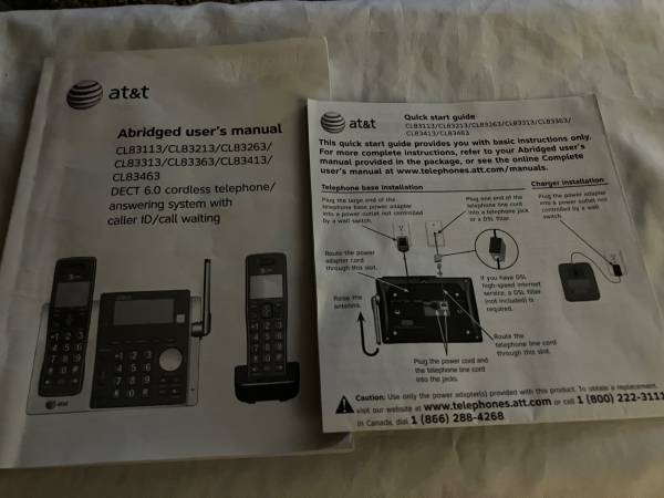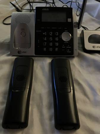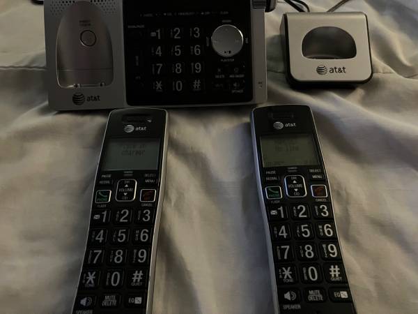 AT&T Answering Machine with 2 Cordless Phone Hand Sets. Instruction manual and quick start guide included.