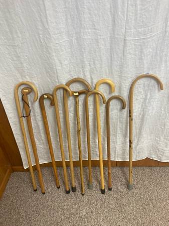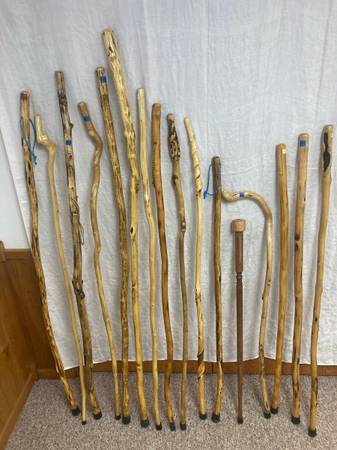 Nice variety of handcrafted walking sticks. Smooth as a baby’s butt! Coated with 3 coats of polyurethane varnish. Over 49 to choose from— all different shapes and sizes. Don’t go to a retail store and buy some foreign junk. Buy local and save yourself some money. Prices are $10.00-$13.00 for the canes . Hiking sticks from $16.00-$25.00. Some hiking sticks have a Wheatback penny or Buffalo nickel recessed in the handle. Not only can hiking sticks be used for keeping your balance —- but they can also be used for to ward off an attack from a wild animal. You won’t be disappointed! Free information with any purchase .CASH ONLY! No SCAMMERS!!!