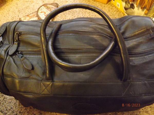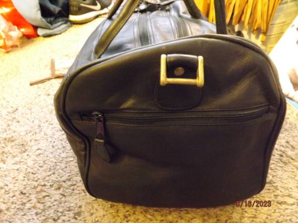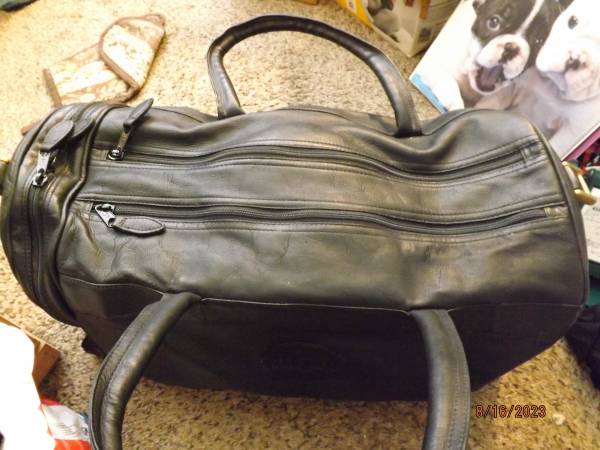 Columbian made by Sedna Co. Condition very good to excellent. Has dual zippered top over main storage (satin like lining) and single zippered sides for additional storage. The black leather shell is very soft, has 5 brass footings on bottom, 2 carry handle straps and two brass end fittings to add shoulder strap not included. Dimensions of travel bag are as follows: 18"l x by 12"w by 8"h. Cost $20. Thanks geo.