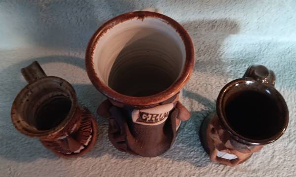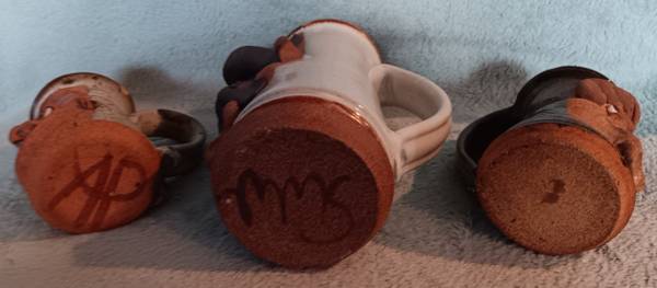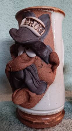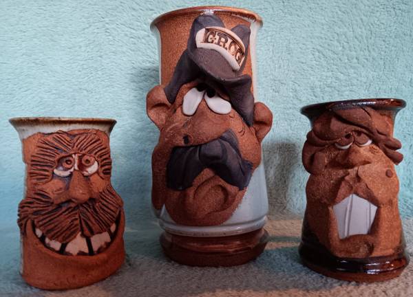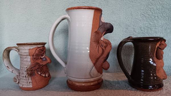 Hand made, signed, vintage 1980s, Mahon stoneware 3D Funny Face goofy mugs. Suitable for hot beverages. Never used, just displayed, in smoke free home. Mint condition. Large mug 8 1/2" high. $39 2...