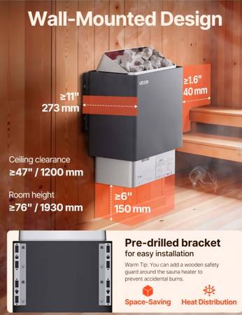 Brand: Vevor 3 Hour Timer Adjustable Temp 9KW 220V Dimension: 16.1" x 10.6" x 22". Note: Sauna stones are NOT INCLUDED Brand new in box
