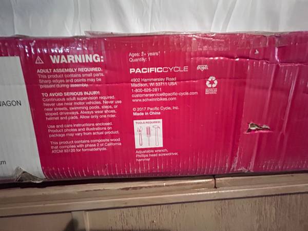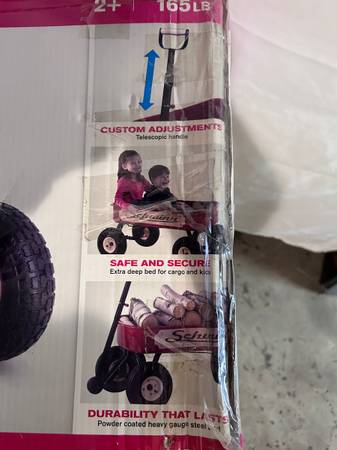 New in box Schwinn Quad Steer wagon. Steering with all 4 wheels . Pneumatic tires. Wagon is unassembled in box. I have another one that used that’s all together that I use that you could see what it looks like in person . This would be a great Christmas present for a child . Or an adult that would like to customize it. I could put it together but it would have to be paid for first .