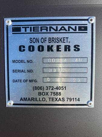 Tiernan Son of Brisket, handmade in Amarillo Texas. A true Texas legend. Large cooking surface 24" x 48" stainless steel cooking surface Smoking box holds charcoal and or wood for easy indirect...