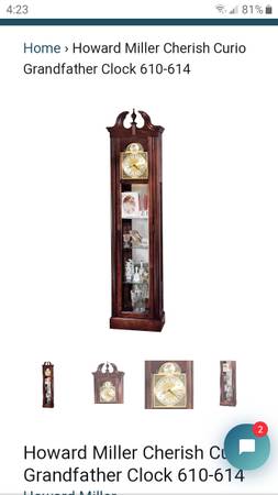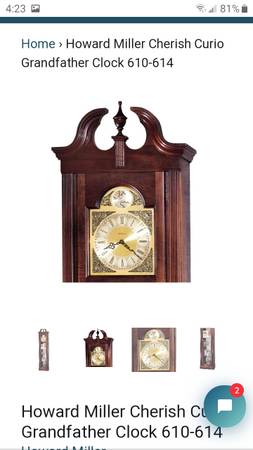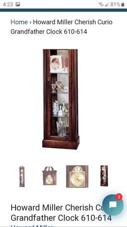 Howard Miller Cherish Curio Grandfather Clock. 610-614. This curio floor clock is lightly distressed and features a graceful swan neck pediment. Tempus Fugit (meaning "time flies") dial features silver chapter ring and decorated corner spandrels. Glass mirrored back, 3 adjustable glass shelves, and a wooden base shelf. Quartz, battery operated movement requires one AA battery. Finished in Windsor Cherry on selected hardwoods and veneers. Cabinet is illuminated by an interior light. Locking door for added security. Made in USA.