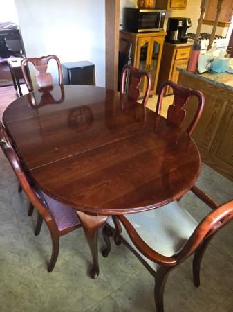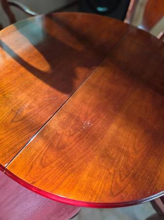 Dining room table and six chairs, very sturdy but has scratches and 2 of the chairs have different upholstery. 43.5 inches round, 68 inches with middle leaf, cash only, you pick up. Phone: