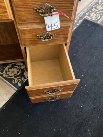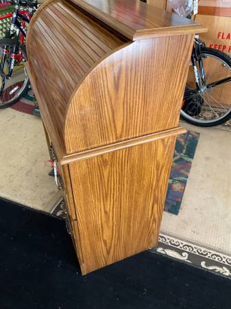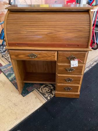Small roll top desk. Measures 35 X 18 and stands 43” tall. Has two deep 10” pull out drawers and one middle drawer. In perfect condition. Call 920-six-zero-six-8484 for address. NO codes.