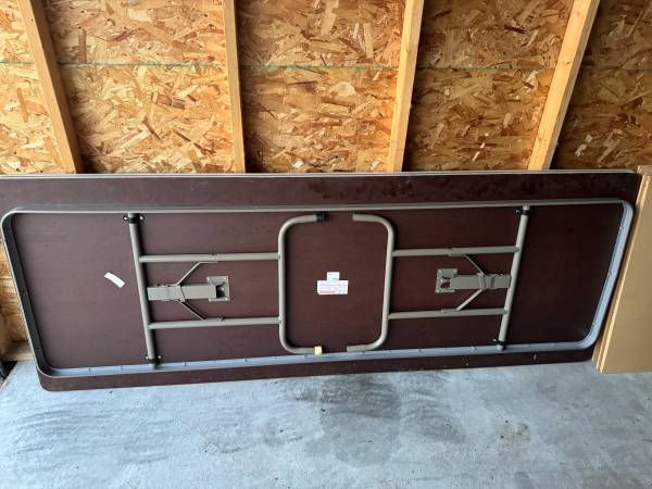 I have 5, 8 ft tables. Heavy duty, legs fold in so they can be stored flat. Wood looking top. $50 each OBO Will sell all in bulk order for less than $50each.