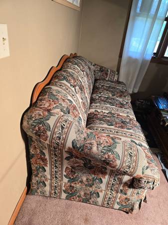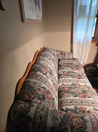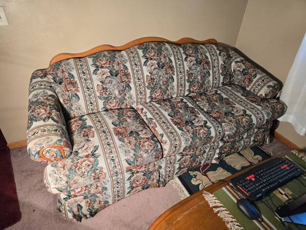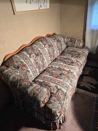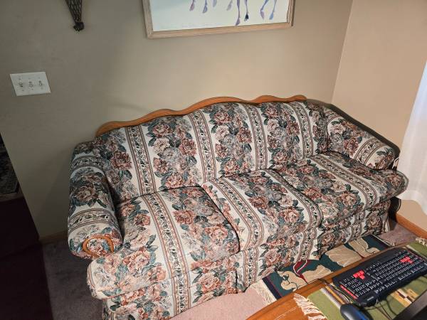 Comfortable, floral pattern couch in clean condition, no animals, no smoking. The couch is on rollers. Easy moving! Length: 7', Depth: 36"