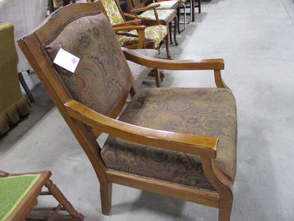 Wood-framed chair brown patterned seat/back See images Or see for yourself at Habitat for Humanity 414 E. Elizabeth St., Shawano open Thurs and Friday 9-4 Sat 9- call to check availability New...