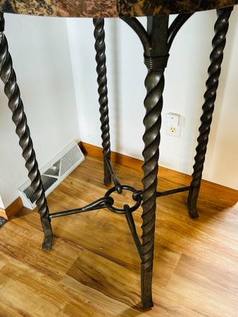 The pub table is supported by 4 very uniquely twisted, solid wrought iron legs. The table top appears to be a granite veneer or possibly cast resin with a copper tone, granite pattern.