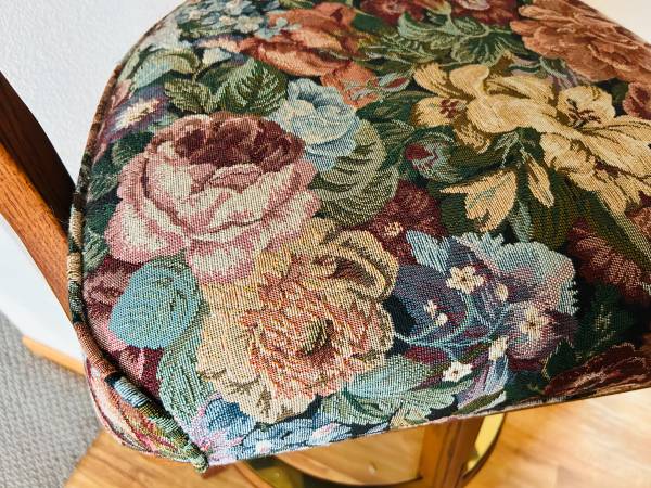 This 3-piece table set includes two very heavy duty, sturdy, 30-inch barstools with Windsor style solid wooden backs. The foot rest is clad in a protective brass accent ring. These sturdy, swiveling arm bar stools are of maple wood in a warm tone Tudor finish and the seats are wrapped in a durable floral fabric.