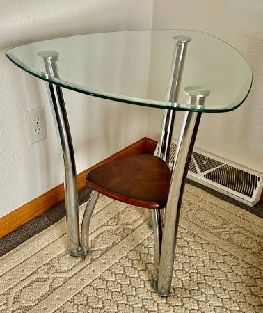 Offered for sale is this Glass Chrome Guitar Pick Side Table By Ashley Furniture. This features a beveled glass table top surface in the shape of a guitar pic. There is a similar, but smaller wooden shelf below in the shape of a guitar pic as well. This is a great accent piece.