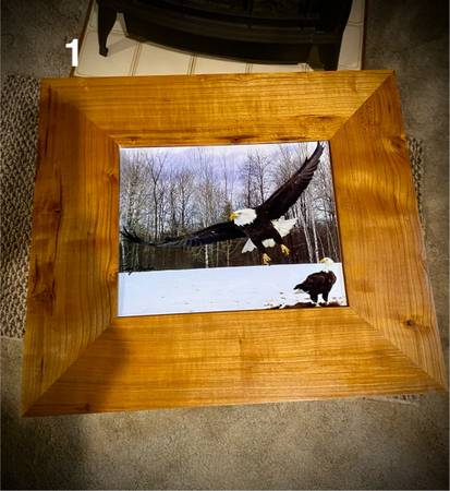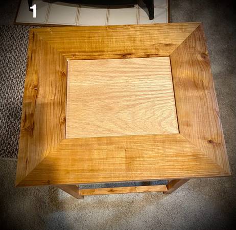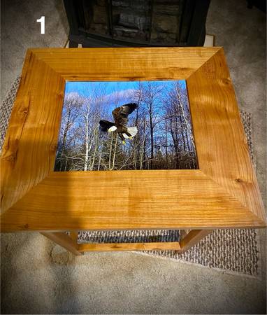 1. Cherry end table w/glass & photo insert; 17 3/4” L x 15 3/4” W x 23 1/4” H; 8x10” photo insert; $125 ea w/eagle photo; $100 w/o photo. Two available.