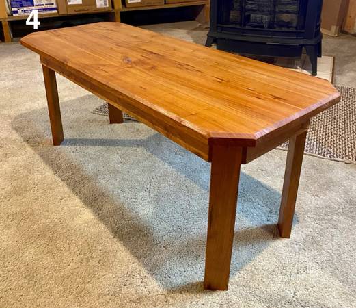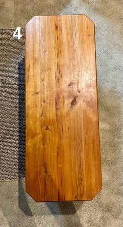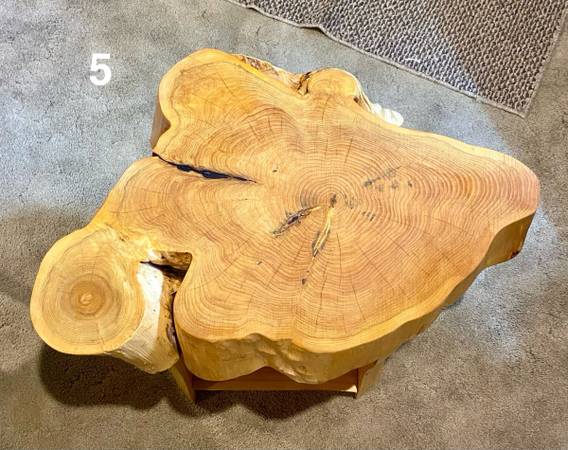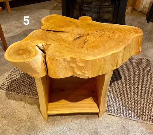 5. Live edge cedar end table; approximately 28” L x 21” W x 19” H; $150