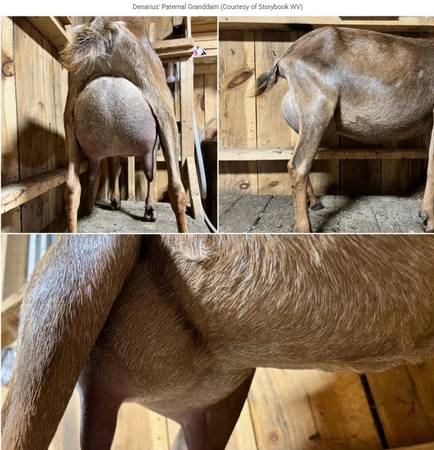 His dam Dolly is a 2F now and easily earned her star as a first freshener last year AND was #1 in MDGA's 2024 TopTen in Butterfat %. She has a super nice, well-attached udder and is one of our heart goats! Her biggest potential area of improvement is foreudder extension, which should grow over the next couple years.