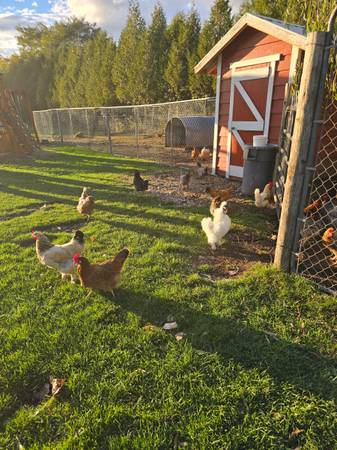 I have 20 plus hens with there free roosters. 8.00 each range from 6 months to 2 years old.