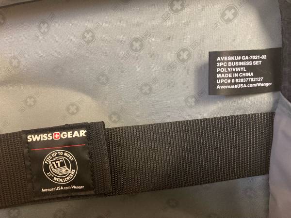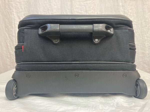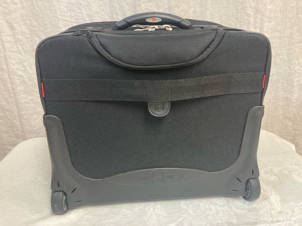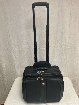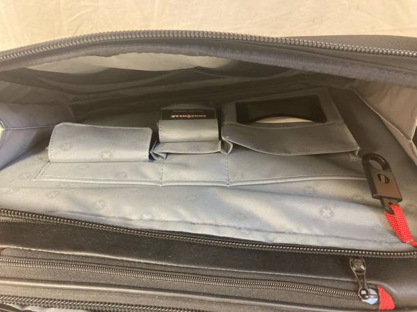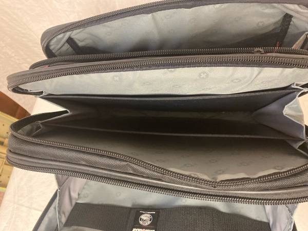 What a nice piece for the money! Lots of zippered compartments to keep everything neatly organized! It measures 9” wide, 17” long and 15” tall. Swiss Gear brand name. Cash only!