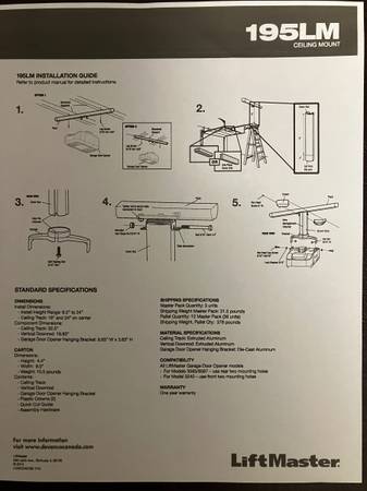 Give your garage door opener a professional look with the 195LM LiftMaster door opener ceiling mount. Its adjustable height is designed to fit most ceilings - hangs 6.5 to 24 inches down from ceiling. Simple DIY instructions make for an easy installation. This is a terrific bargain. Thanks for looking. Pick up in Green Bay only.