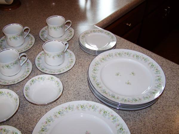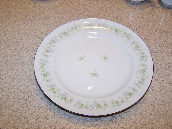 Vintage Johann Haviland Bavaria Germany China Set "Forever Spring" pattern set of China dishes for sale! This pattern is circa 1984. (I have seen many "Forever Spring" pieces available on eBay if you would want to ad to this set) The china is a high gloss white with platinum trim. The floral border is composed of green/pink, white/yellow and green flowers. The center area of the dinner plate has three sprigs of flowers. This set includes 35 pieces and is in excellent condition!! See Pics!!!