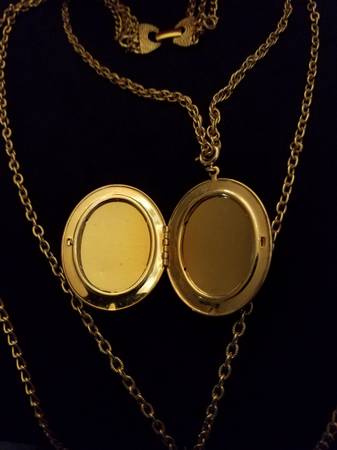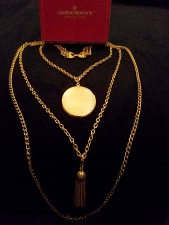 Vintage Caroline Emmons triple strand goldtone locket and tassel necklace with box, never worn.