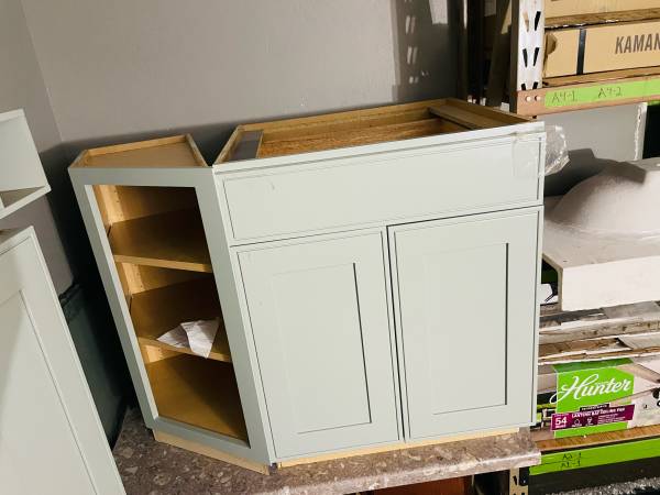 Note: These cabinets were never used in a functioning kitchen. They were in the middle of installation when we discovered door issues. We decided to order new cabinets to complete the project on schedule, so this set is being sold as-is.