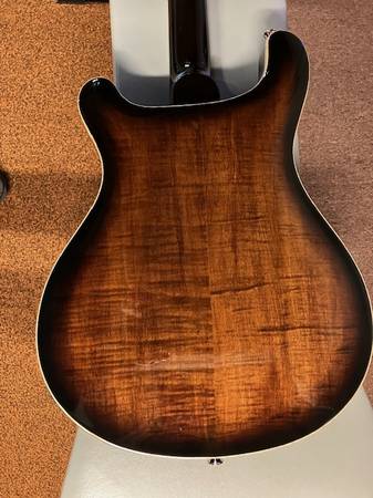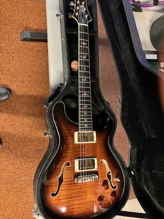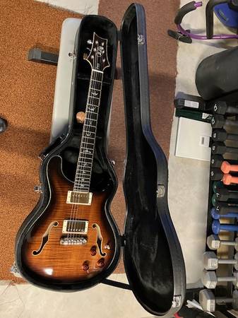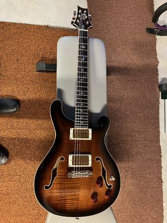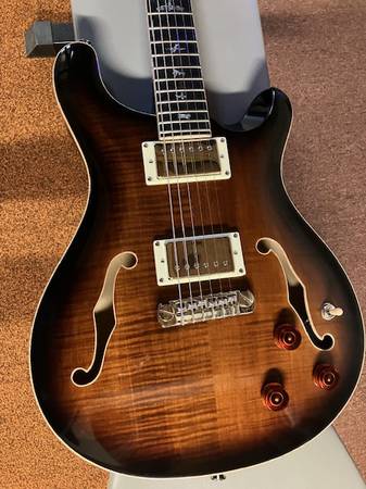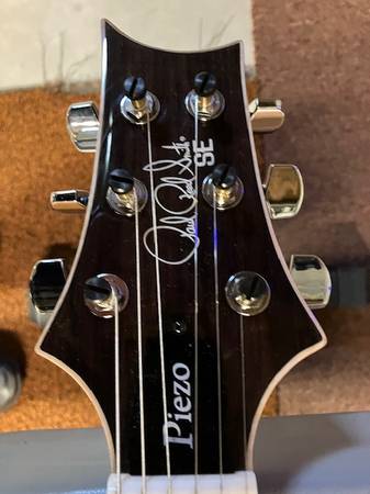 The SE Hollowbody II Piezo combines the balanced, clear, resonant tone of a hollowbody instrument with the power and stability of a solid-body electric guitar. Constructed with a maple back and top with mahogany sides, the SE Hollowbody II Piezo offers a light shimmer and snap in an attractive package.Now boasting a newly-designed LR Baggs/PRS Piezo system, the SE Hollowbody II Piezo provides musicians with the versatility of wielding both acoustic and electric tones in one instrument. The instrument is designed with two discrete volume controls (magnetics and piezo) and output jacks (mix/piezo and magnetics). Players can plug into the “Mix/Piezo” jack and use the individual volume controls to blend the 58/15 “S” pickups with the piezo’s acoustic tones. Alternatively, players can plug into the jacks separately, so the guitar can run magnetic pickups into an amp and run the piezo through an acoustic amp or DI into the soundboard. When using the magnetic output jack in isolation, the piezo battery is bypassed completely, acting as a failsafe (in this scenario, the magnetic pickups still work even if the piezo battery has run out of juice). This is the most versatile SE instrument in the Series. There is a little scuf mark by the jacks you can see in the picture. This guitar also has locking tuners.