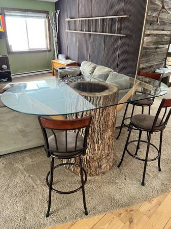 Bar Height glass table, Center log hollow white ash. 6 foot length. top 1/4 in tempered glass great for camp, basement bar, man cave, etc.