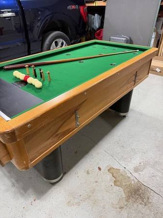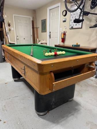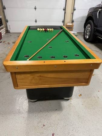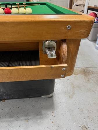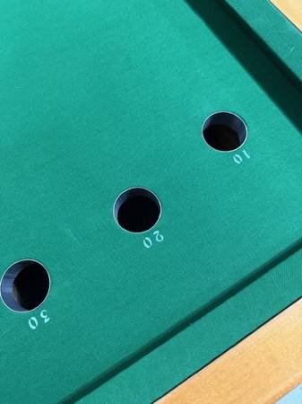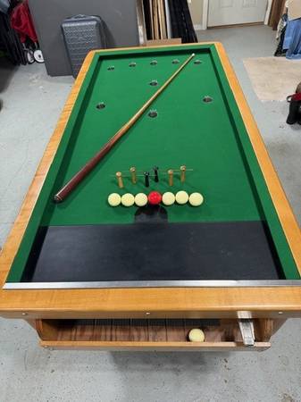 The Table is in very good condition. The game is played from one-end so it is convenient for tight spaces and could be pushed up against a wall. Includes a New set of cue balls, (smaller than typical bumper pool cue balls) and one cue stick. A very fun game and difficult to find. Actually this is the only one that I have ever seen. This is a popular game in England and vintage tables are $4000.00 +. Sale price $750.00 For a video of how to play, search youtube videos, YouTube·Michael Chartres·Aug 26, 2018