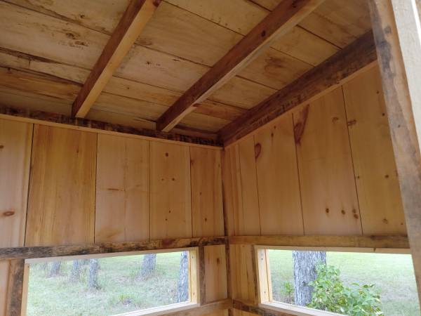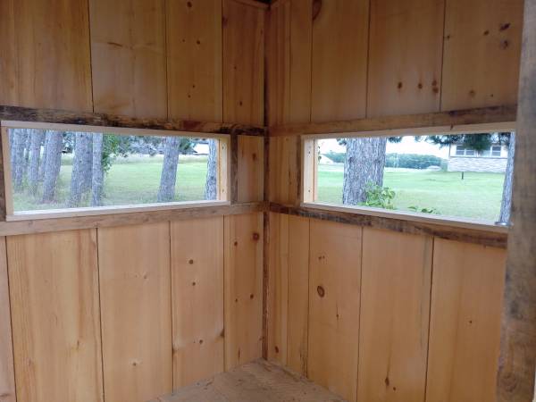 For sale new 5'x5'-$700 or 6'x6'-$850 deer hunting shack / blind / shooting house. They are selling fast. They're all 2x4 and better construction, all have battoned vertical board exteriors and shingle roofs with T edge. Wide sliding windows with knobs. The door side is 7' high and the front side 6' high giving nice pitch for weather and inside headroom. Roofs overhang all sides. We can load them onto your trailer. Us trailering to your site may be possible but would cost extra and you need provide equipment and help to unload. They are built on skids to be able to pull/move. Call Dale at nine2zero-897-3628 for questions text Chris at nine2zero-246-3695