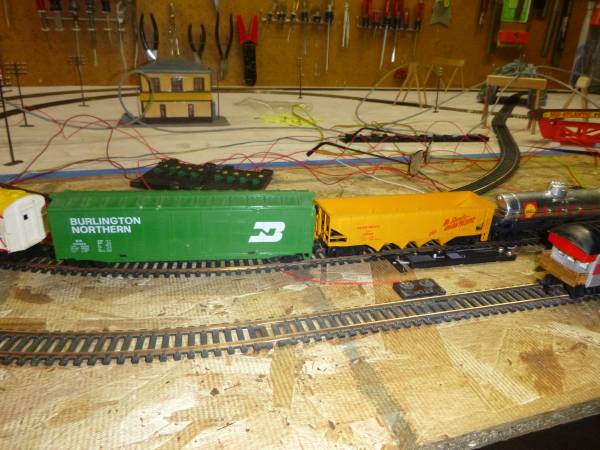 All items in this set have been restored, cleaned, well tested and run good. Layout size is 4x8. Tracks are Atlas code 100 HO scale. Set includes; two engines, passenger cars, freight cars, track and switches, dual train transformer, tunnel and structures, an uncoupling track, pair of lighted bumpers, a telephone pole and road sign set, and a neat vintage Pipe Loader accessory. The loader drops the pipes into the car, and the red tray is for tipping the car to dump the pipes into.