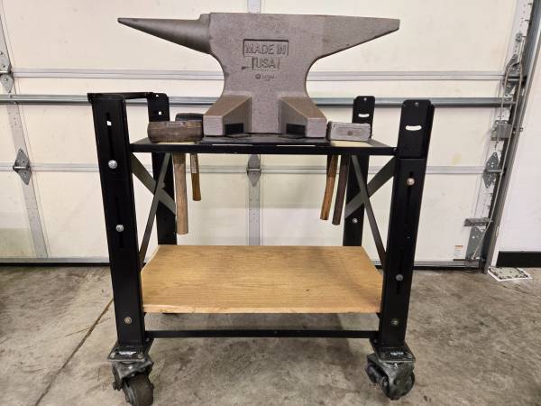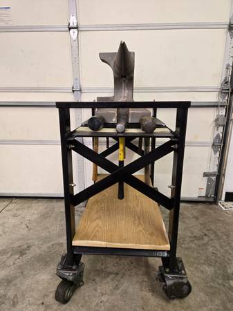 Blacksmith anvil mounted on a movable cart with 1000 lbs swivel casters.