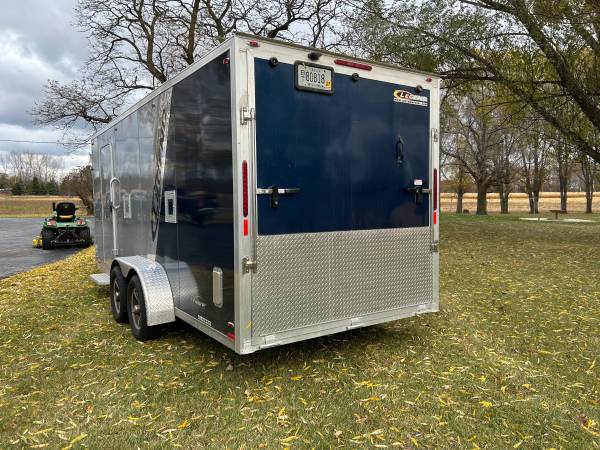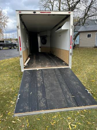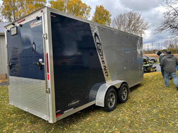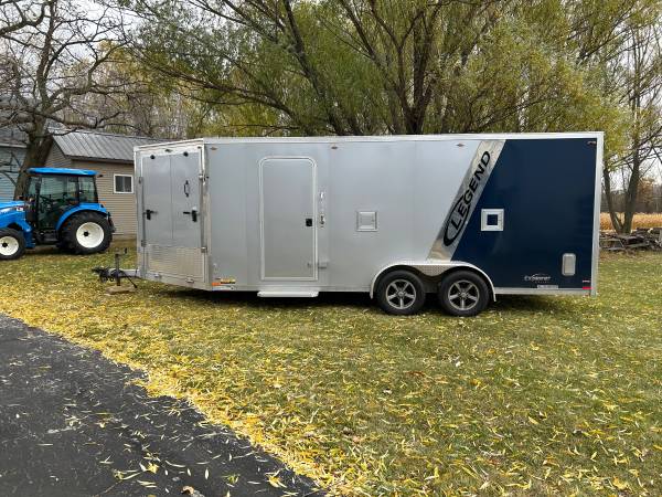 2018 legend, enclosed trailer, 7’ wide x 23’ long, with rear door - 74 inches wide 78 1/2 inches tall, two side gas doors, side drive out door, built in cabinet and shelf, spare tire, interior...